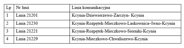 Przedmiotem zamówienia jest świadczenie publicznego transportu zbiorowego na terenie Gminy Kcynia. Zamówienie obejmuje wykonywanie regularnego przewozu osób na następujących liniach komunikacyjnych: