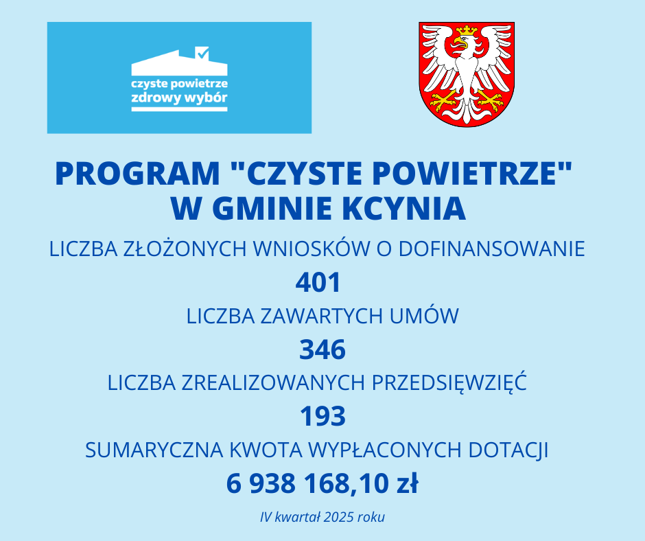 Dnia 1 kwietnia 2025 r. Gmina Kcynia podpisała Porozumienie z WFOŚiGW w Toruniu dotyczące występowania gminy w roli "operatora" przy wdrażaniu programu priorytetowego Czyste Powietrze. Operator programu „Czyste Powietrze”udziela pomocy Wnioskodawcom i beneficjentom kwalifikującym się do podwyższonego i najwyższego poziomu dofinansowania Programu w wersji obowiązującej od 2025 r. Operator oferuje pełną opiekę i wsparcie beneficjentowi programu „Czyste Powietrze” od podjęcia decyzji o realizacji inwestycji, przez proces inwestycyjny, aż do jego zakończenia i rozliczenia umowy o dofinansowanie. Gminne wsparcie w roli operatora ma na celu dotarcie w szczególności do osób starszych i ubogich energetycznie.